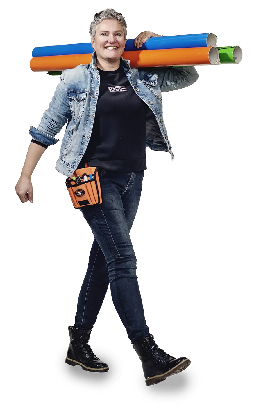 Zo langzamerhand ken ik alle klappen van de zweep wel. Ik doe echt van alles. Veel mensen kloppen bij me aan voor een logo of een huisstijl. En daar eindigt het dan bij. Omdat de meeste niet weten dat ze me ook mogen bellen voor vlaggen, voertuigreclame, stickers en volledige beursstands. Ik hoor heel vaak: ‘Had ik maar eerder geweten dat je het hele traject aankon. Van A tot Z. Dan had ik het jou gegund.’ Dus, kom maar op met alles wat te maken heeft met de uitstraling van jouw bedrijf. Ik ben er klaar voor.